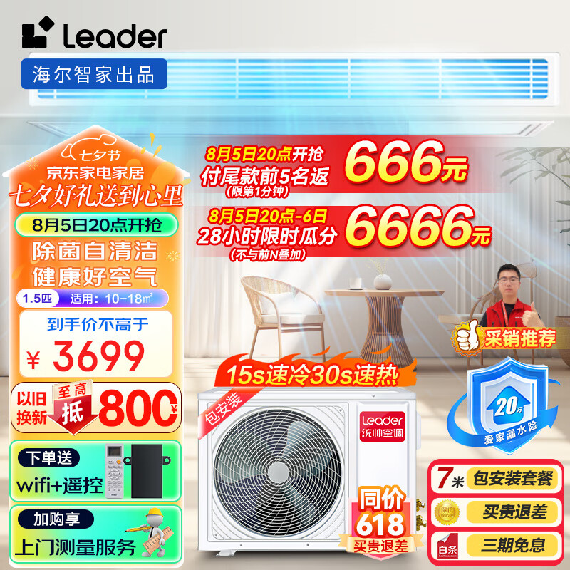 Leader海尔智家出品风管机一拖一1.5匹中央空调1.5p嵌入式卧室空调变频健康自清洁KFRd-35NW/70DBB82ST价格:3699.00元!
