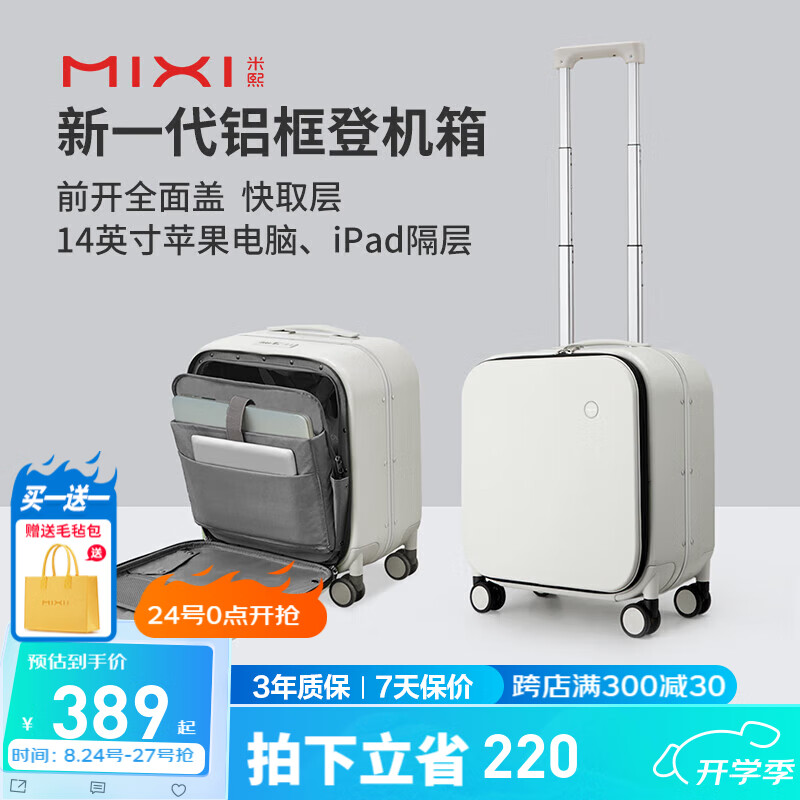 米熙前开盖拉杆箱子登机箱女铝框箱行李箱大容量男旅行箱18英寸烟白60价格:609.00元!
