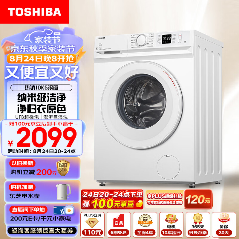 东芝(TOSHIBA)滚筒洗衣机全自动 10公斤大容量 BLDC变频电机 UFB超微泡 澎湃巨浪洗 以旧换新 DG-10T11B价格:2199.00元!
