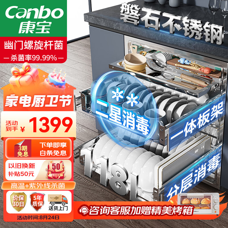 康宝(Canbo)118L三层 不锈钢 磐石 消毒柜 嵌入式 家用 碗筷大容量厨房餐具二星高温板架消毒碗柜XDZ110-EN321价格:1399.00元!