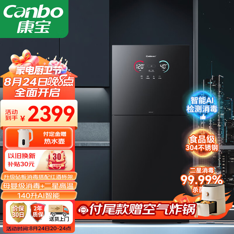 康宝(Canbo)消毒柜家用140升不锈钢智能立式母婴儿餐具碗筷二厨房大容量热风砧板消毒碗柜XDZ140-LF7极智价格:2399.00元!