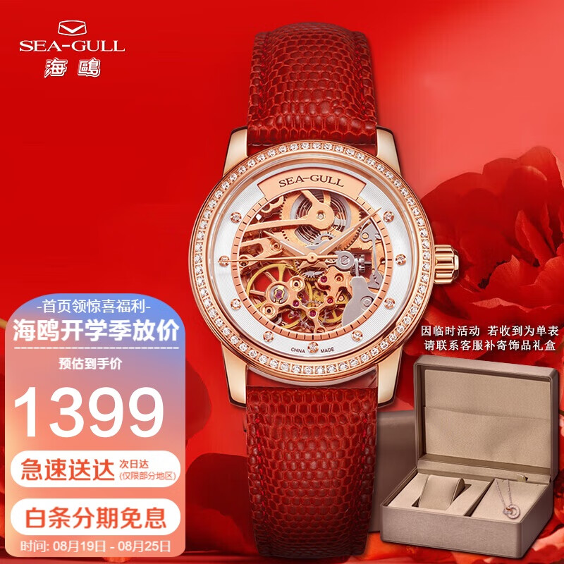 海鸥(SEAGULL)手表女士自动机械表 女表送女友礼物 镂空腕表 719.403LK(红)价格:1549.00元!