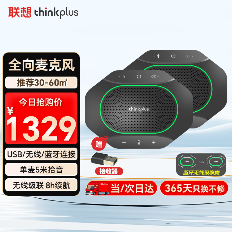 联想thinkplus视频会议全向麦克风5米拾音器免驱蓝牙无线级联同收同放桌面型扬声器30~60㎡MK-MC600*2价格:1329.00元!