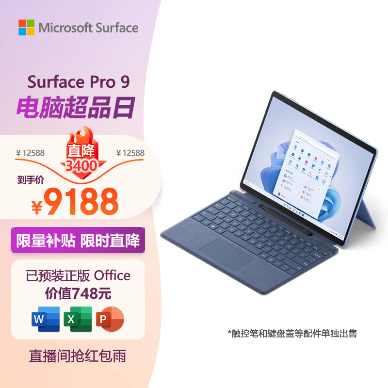 微软Surface Pro 9 二合一平板电脑 i7 16G+256G宝石蓝 13英寸120Hz触控屏 游戏平板 笔记本电脑价格:9188.00元!