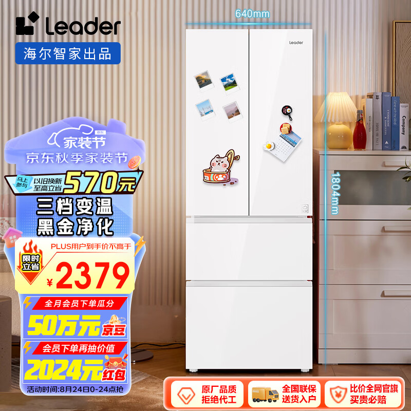 Leader 海尔智家出品345升彩晶风冷净味一级能效节能法式四门多门以旧换新电冰箱BCD-345WLLFDD9CW1U1价格:2699.00元!