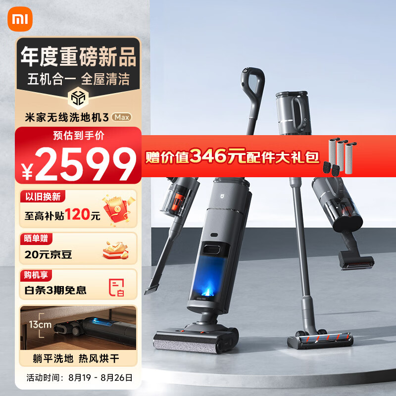 米家小米无线洗地机3Max 扫地吸尘洗拖除螨多合一 180°躺平全屋清洁 全链杀菌 热风烘干 家用吸尘器价格:2599.00元!