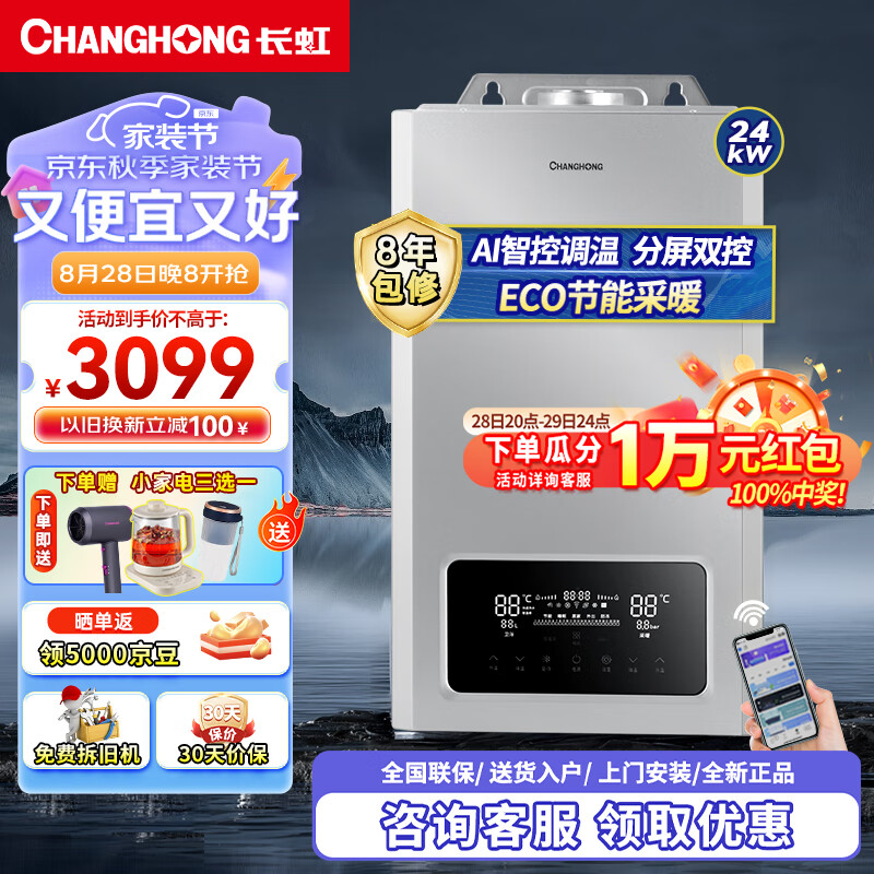 长虹(CHANGHONG)燃气壁挂炉家用天然气双温双控APP智控多段式燃烧锅炉供暖暖气片地暖热水两用恒温以旧换新24C1价格:3499.00元!