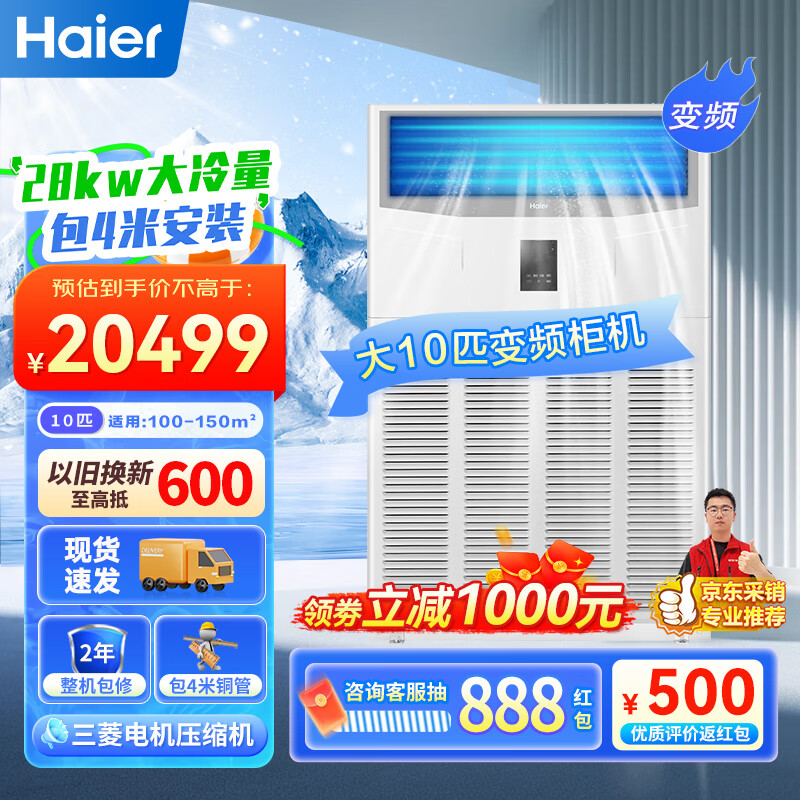 海尔(Haier)10匹柜式空调中央空调直流变频自清洁2级能效三菱压机冷暖380V 4米包安装 RFLDC280DXSAYC(G)价格:21499.00元!