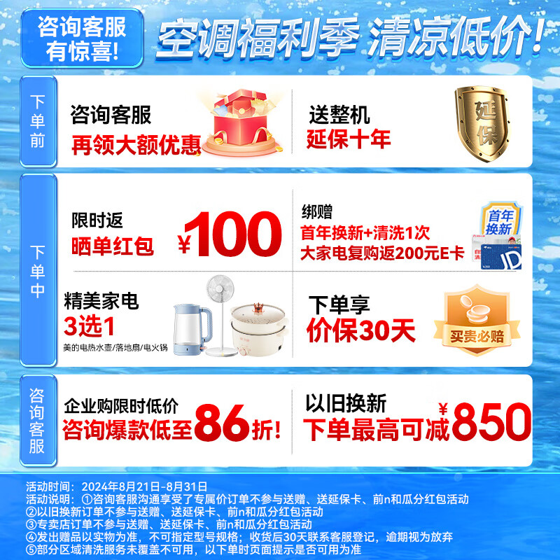3、京东商城购物真的很方便,今天下单后天就送到了,客服人员态度耐心细致,安装师傅也是负责任,及时解决了我的安装问题。对顾客而且处理及时。空调的制冷效果也特别棒,美的空调都算大牌子了,质量过关。公司的车间里装上美的空调后立即就凉快了。