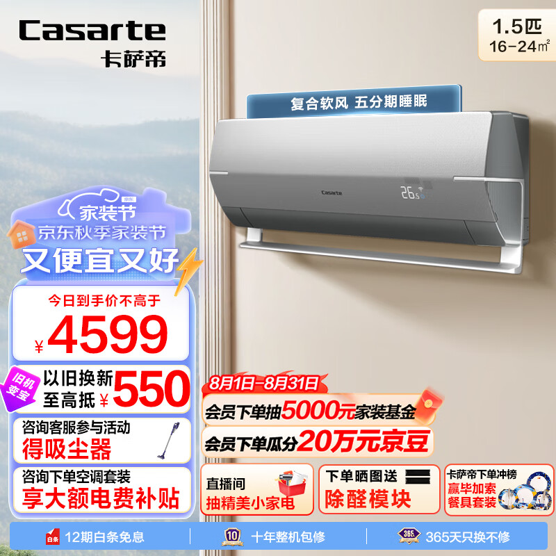 卡萨帝(Casarte) 1.5匹 星云 复合软风 舒适除湿 壁挂式空调挂机 一级能效 智能变频 卧室 CAS3516BAB(81)U1价格:4599.00元!
