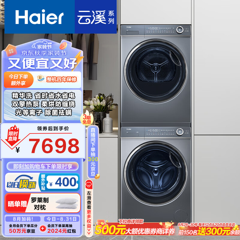 海尔(Haier)云溪376洗烘套装轻享版 10KG精华洗超薄滚筒洗衣机全自动+双擎热泵烘干机家用 376+176XS 以旧换新价格:8198.00元!