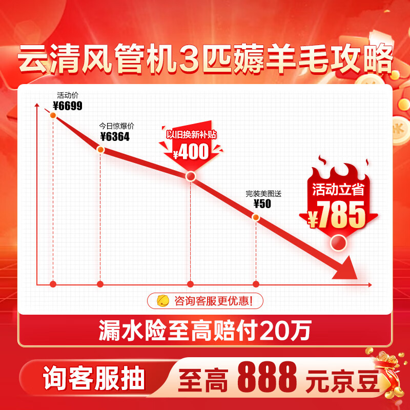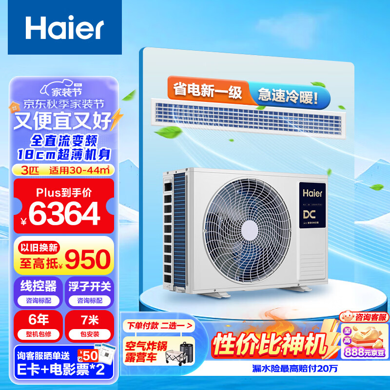 海尔云清风管机 中央空调一拖一 3匹嵌入式空调 变频一级 客厅 KFRd-72NW/72ECA81A包安装 京配价格:6699.00元!