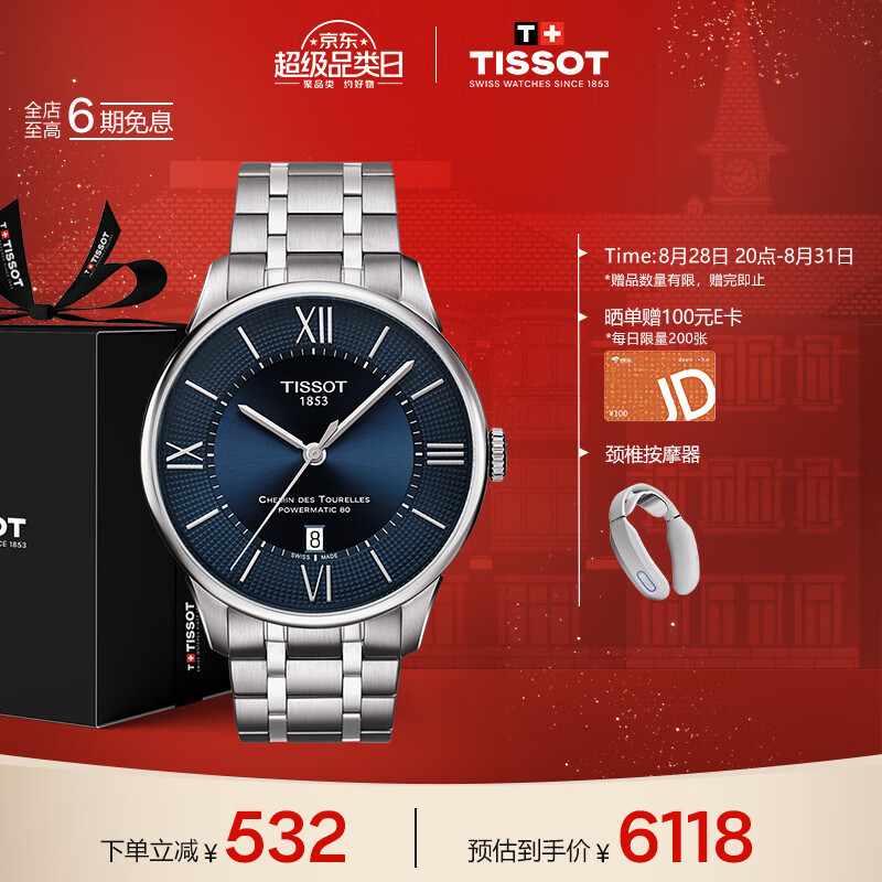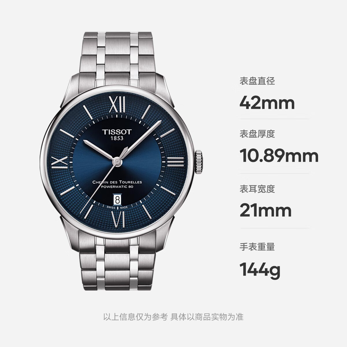 4、表盘深邃的蓝色,很有内涵,精钢表带很耐磨,之前有一块天梭力洛克戴了几年,送人时表带也很亮,没有特别花,所以对天梭的表带很有好感,之前的力洛克储时没有杜鲁尔的长,这块表三天快五秒,感觉算是机械表里比较准的了,一直在关注,双十一下手感觉很划算,50米的防水日常生活够用了,很喜欢的一款表