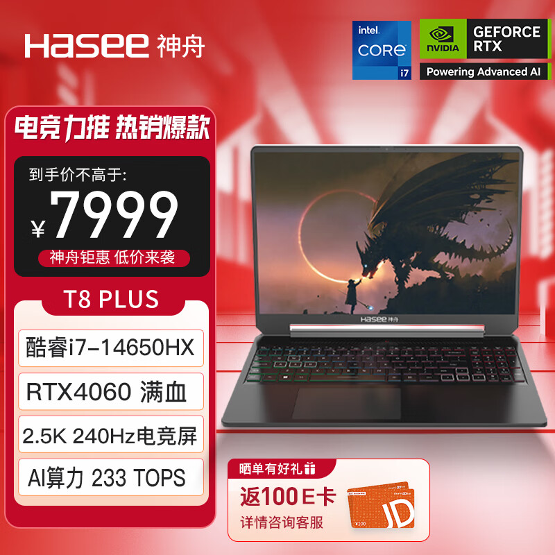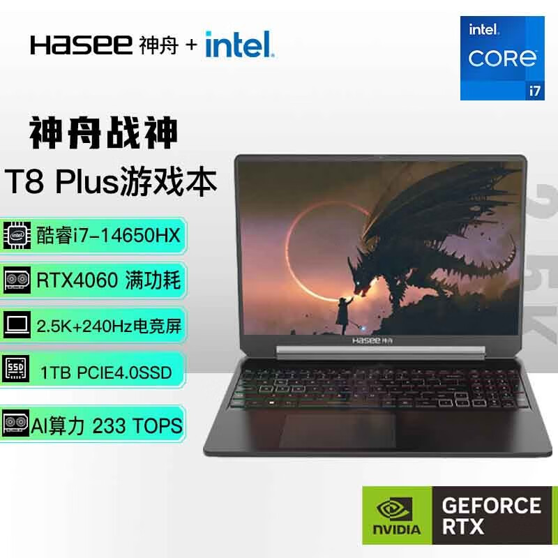 神舟(HASEE)战神T8 Plus 14代英特尔酷睿i7 16英寸游戏本 笔记本电脑(I7-14650HX RTX4060 240Hz 2.5K电竞屏)价格:7999.00元!