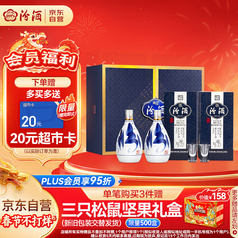 汾酒 青花20 清香型白酒 53度 375ml*2瓶礼盒装 商务送礼 年货礼盒价格:739.00元!