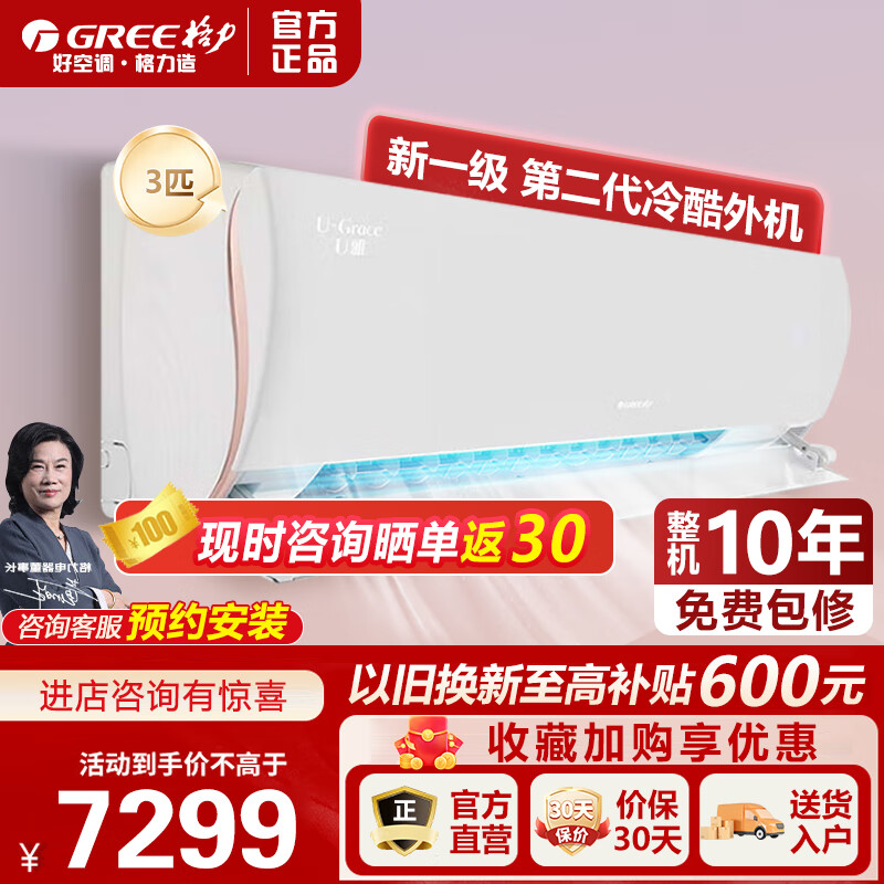 格力(GREE)空调3匹 U雅 新一级能效 变频冷暖自清洁 速冷大风量 壁挂式空调挂机 智选(1)价格:7169.00元!