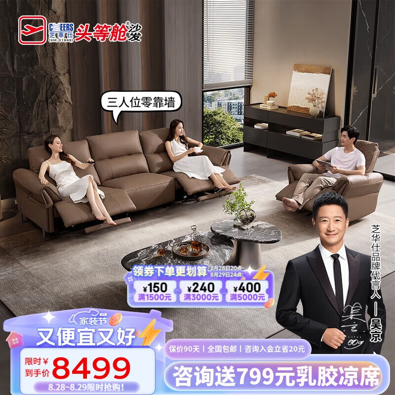 芝华仕(CHEERS)头等舱零靠墙意式真皮功能沙发大户型直排客厅芝华士50795棕3+1价格:8499.00元!