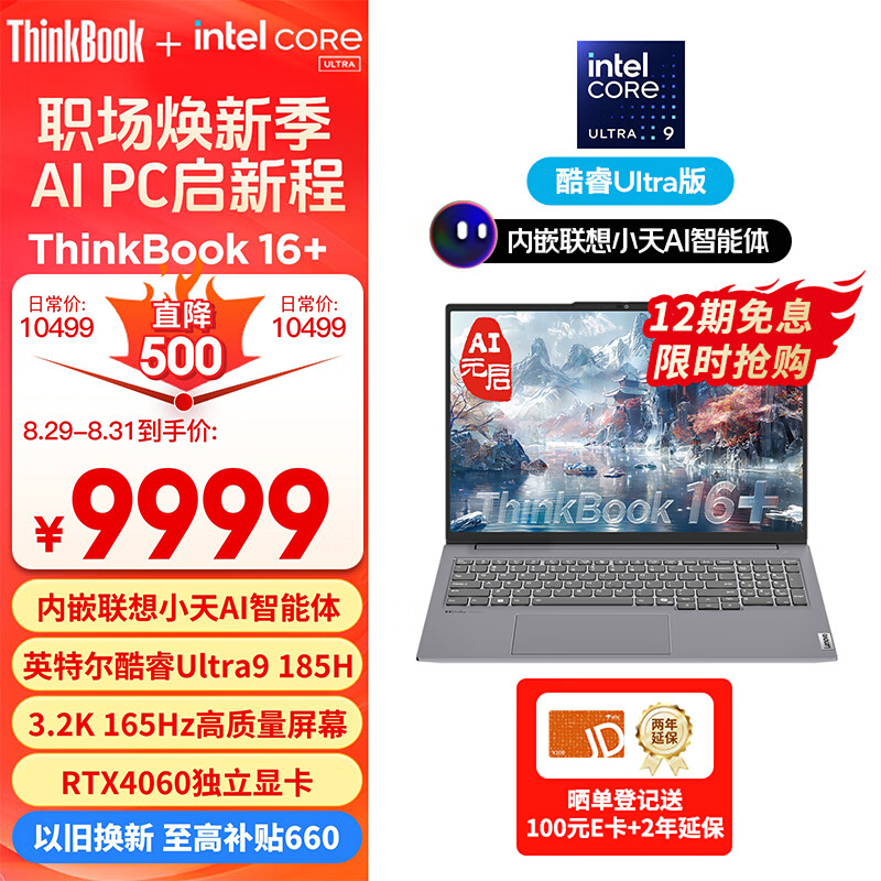 ThinkPad联想笔记本电脑ThinkBook 16+ 2024 AI全能本 英特尔酷睿Ultra9 185H 16英寸 32G 1T 3.2K RTX4060价格:9999.00元!