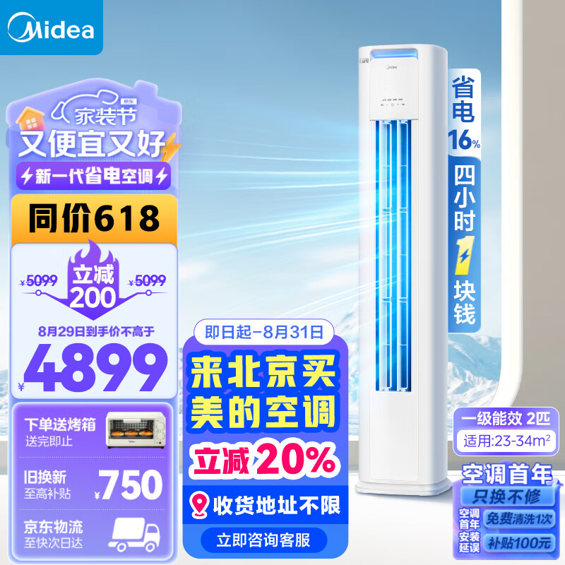美的(Midea)空调 2匹 酷省电 新一级能效 变频冷暖 空调立式 客厅空调柜机 云朵系列 KFR-51LW/N8KS1-1P价格:4899.00元!