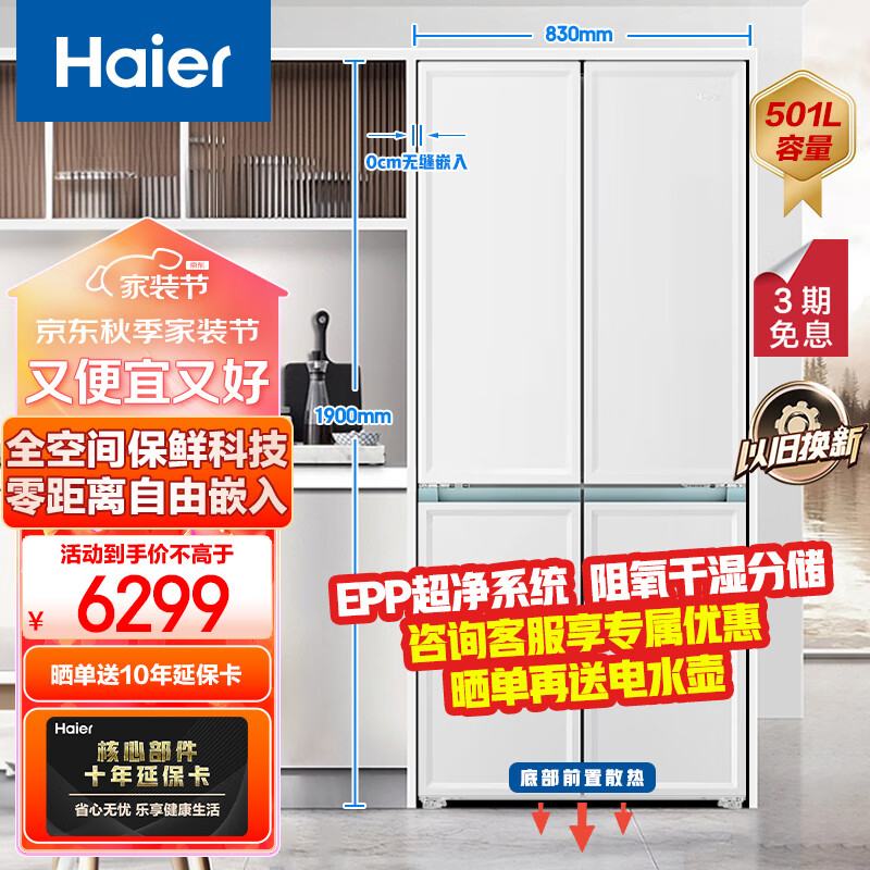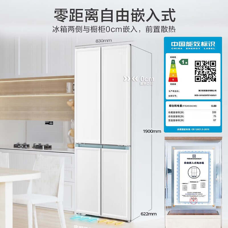 海尔(Haier)冰箱太白系列超薄零嵌全空间保鲜十字门风冷无霜一级能效大容量电冰箱BCD-501WGHTD14W9U1[家电]价格:6799.00元!