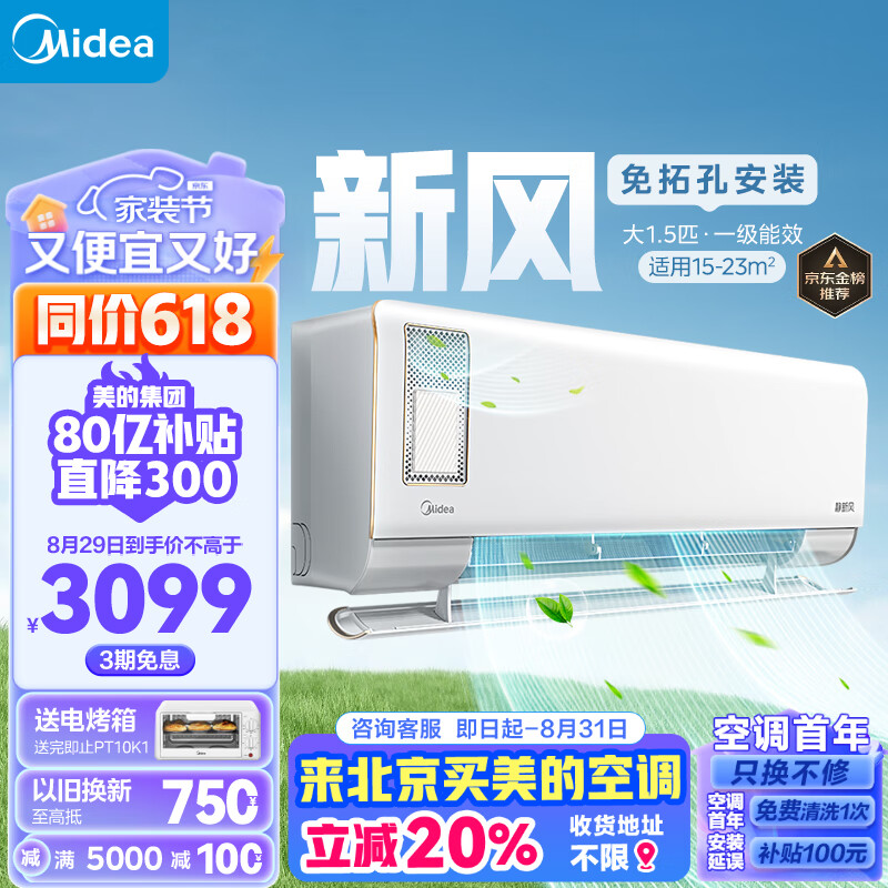 美的(Midea)新风空调 大1.5匹 静新风 新一级能效 变频冷暖除湿 壁挂式空调挂机 KFR-35GW/N8XF1-1定制版价格:3099.00元!