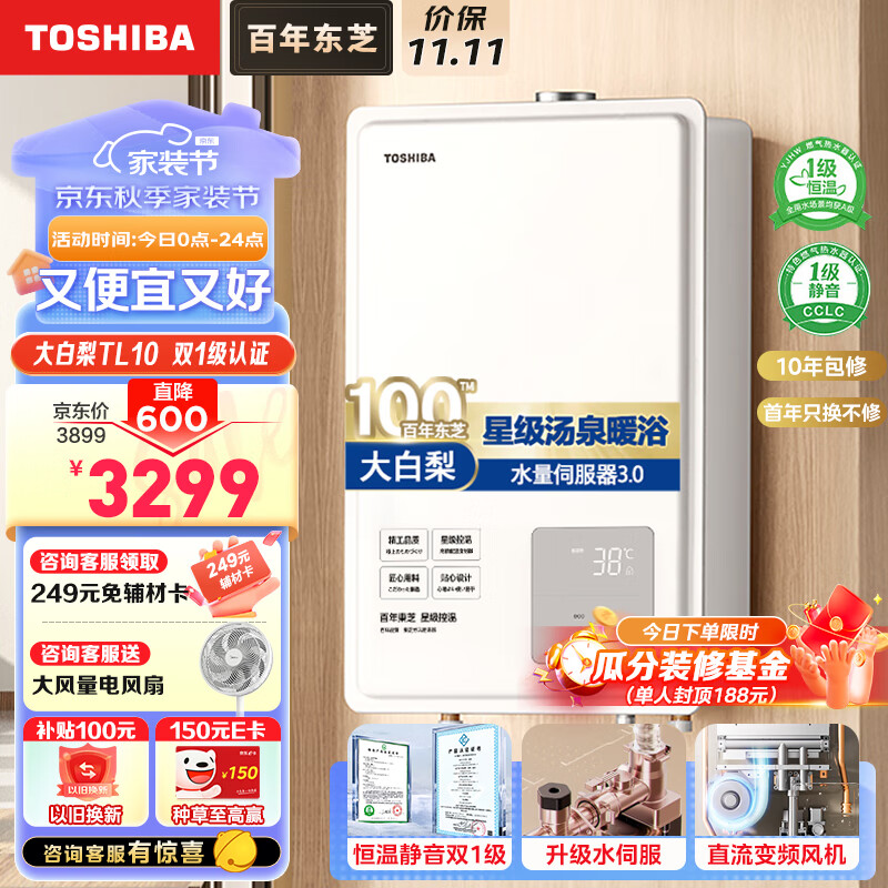 东芝(TOSHIBA)16升大白梨TL10 燃气热水器天然气 一级恒温增压水伺服2.0 一级静音下置风机 日式外观JSQ30-TL10价格:3599.00元!
