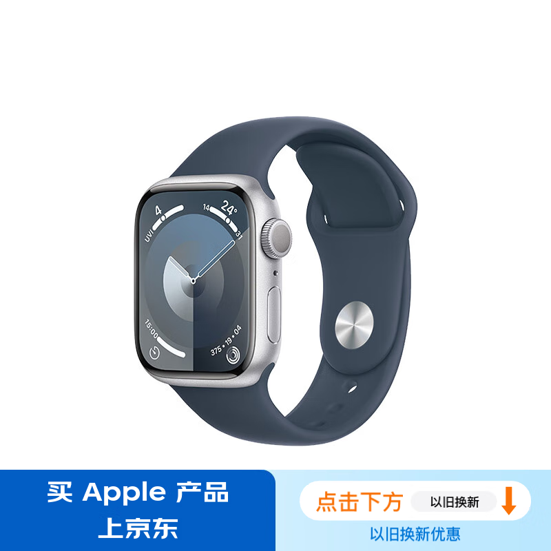 Apple/苹果 Watch Series 9 智能手表GPS款41毫米银色铝金属表壳 风暴蓝色运动型表带S/M MR903CH/A价格:2999.00元!