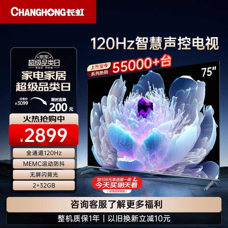长虹电视75D6 75英寸120Hz高刷免遥控语音杜比视界 2+32GB MEMC四大投屏 4K平板液晶LED电视机以旧换新价格:2999.00元!