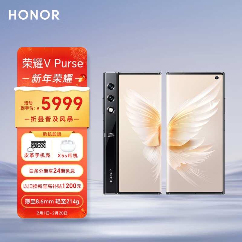 荣耀V Purse 折叠屏 8.6mm超轻薄 2K超清大屏 超自由写真相机 5G手机 16GB+256GB 雅黑色价格:5999.00元!