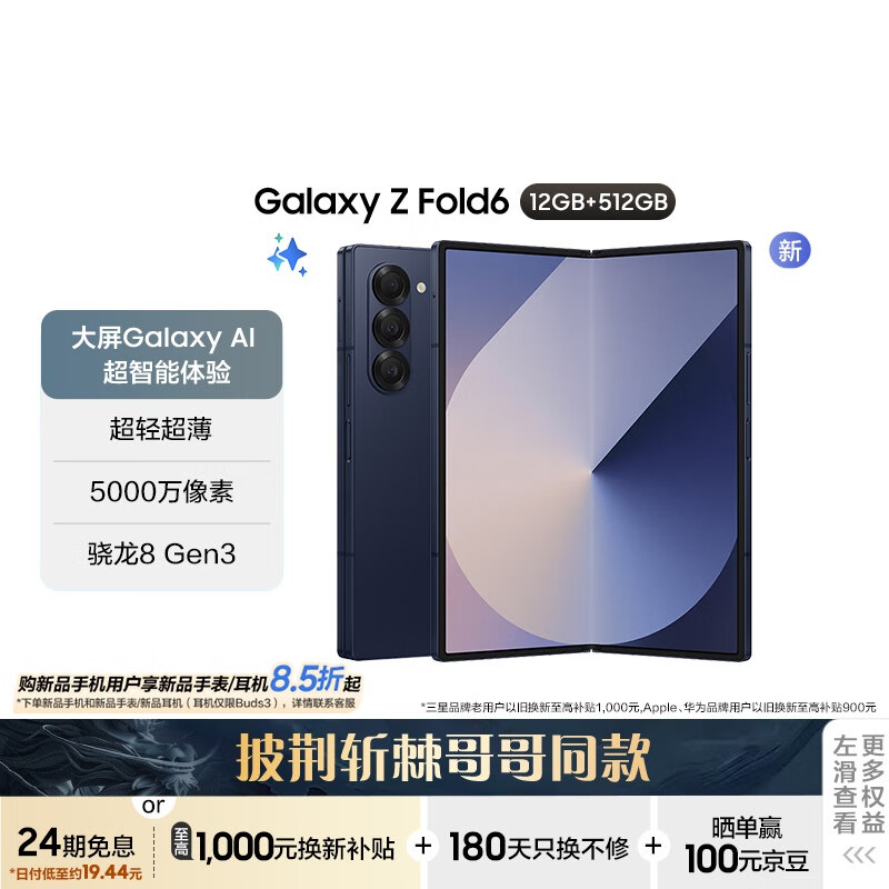 三星(SAMSUNG)Galaxy Z Fold6 大屏AI手机 超轻薄折叠屏手机 披荆斩棘哥哥同款 游戏手机 12GB+512GB 冷夜蓝价格:13999.00元!
