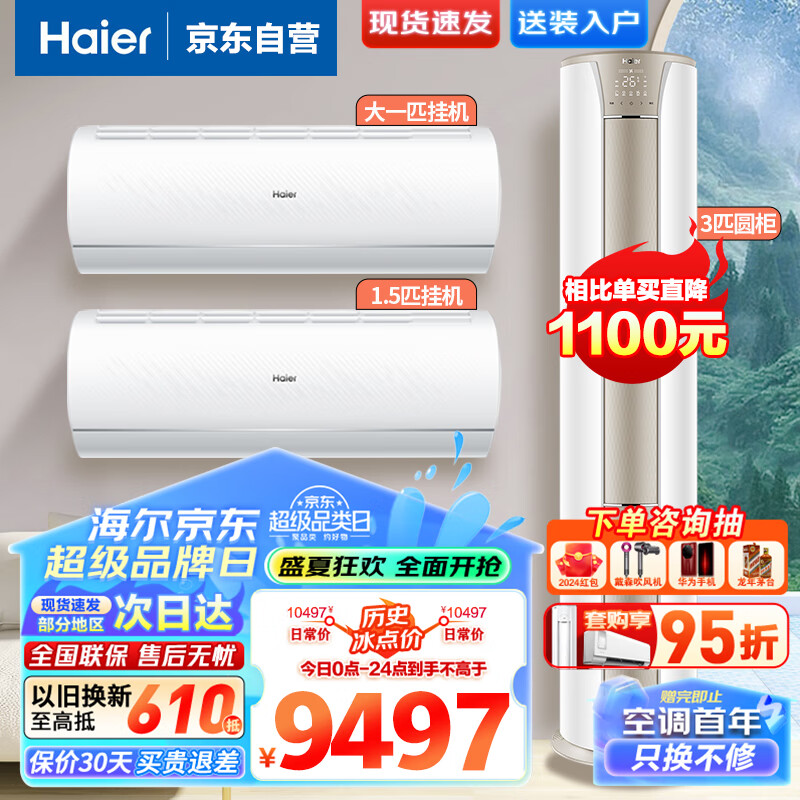 海尔(Haier)空调两室一厅套装新一级能效变频冷暖 大1匹空调+1.5匹空调+3匹空调 WiFi智控 光感睡眠 以旧换新价格:9497.00元!