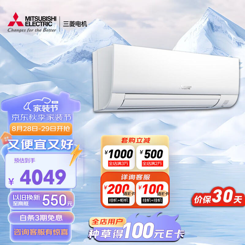 三菱电机10-15㎡适用 以旧换新 新三级能效 1匹 变频冷暖 家用舒适空调壁挂机 内部清洁运转 MSZ-BZ09VA价格:4049.00元!