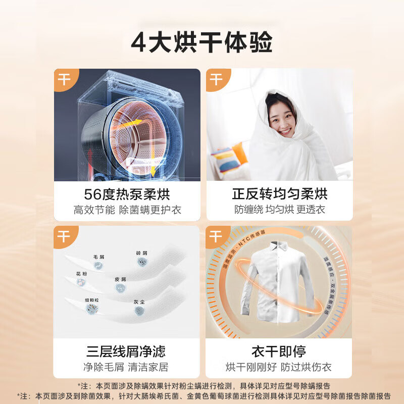 5、外形外观:外观时尚给人一种科技感洗净效果:洗净比1:1,目前算是天花板级别了容量大小:10KG的容量满足一家人的需求除菌效果:56℃高温除菌除螨,除菌高达99.99%,100%除螨