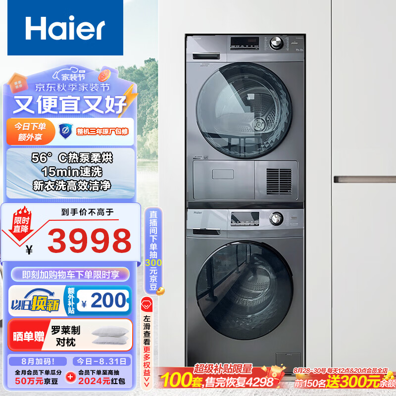 海尔(Haier)洗烘套装 10KG洗滚筒洗衣机全自动+热泵烘干机家用 1.08洗净比 新衣洗 MATE21S+21S 以旧换新价格:4298.00元!