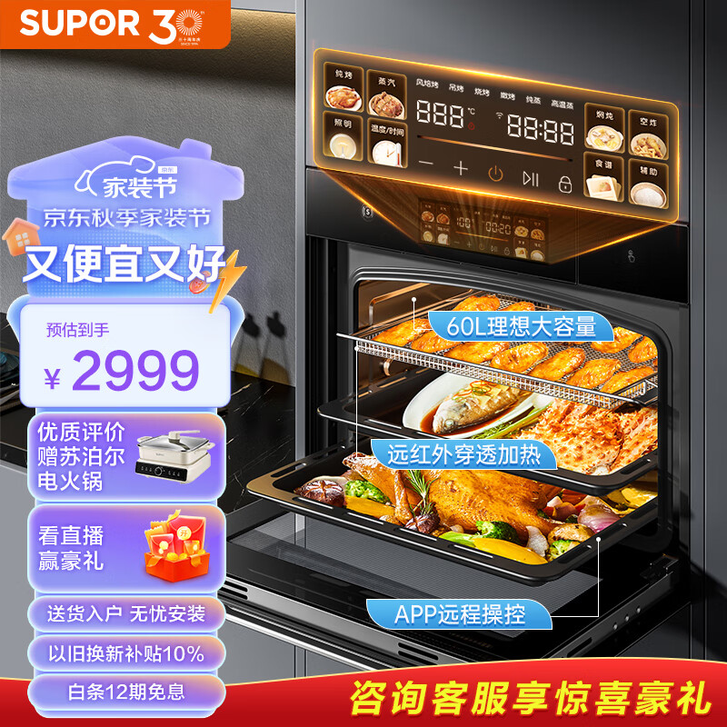 苏泊尔(SUPOR)嵌入式蒸烤炖炸一体机家用智能多功能蒸箱烤箱炖煮空气炸 60LAPP操控蒸汽自清洁 DY58蒸烤价格:2999.00元!