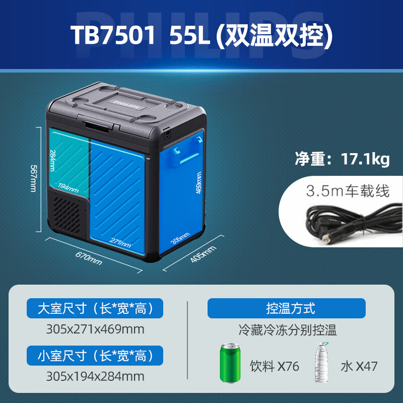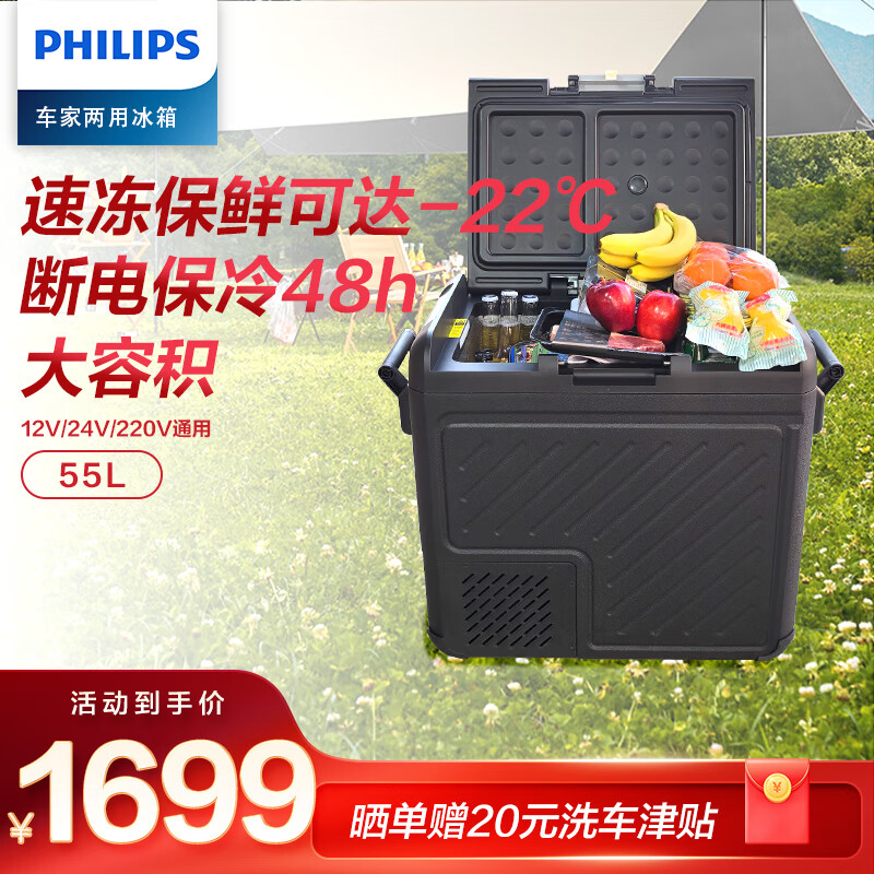 飞利浦(PHILIPS)车载压缩机制冷冰箱55L 货车轿车车家两用12V24V冷冻冷藏分区防震价格:1699.00元!