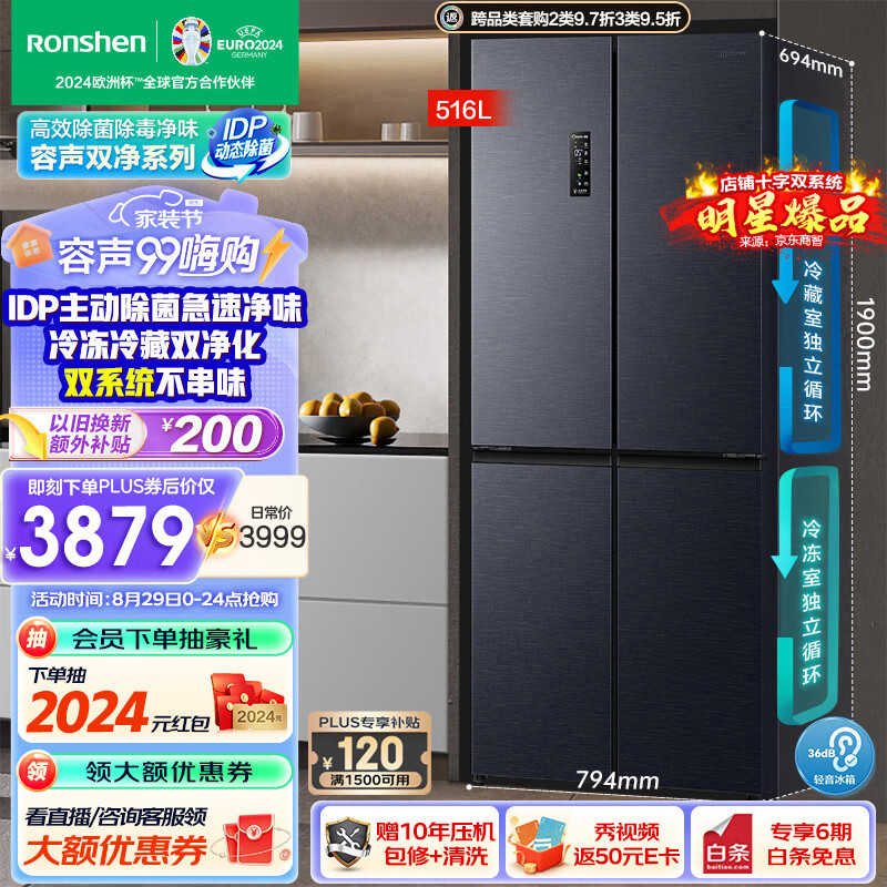 容声(Ronshen)516升双净双系统电冰箱十字双对开门四开多门家用风冷无霜灰色一级节能变频大容量BCD-516WD1FPA价格:4499.00元!