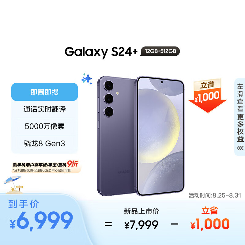 三星(SAMSUNG)Galaxy S24+ AI手机 智享生活办公 5000万像素 拍照手机 第三代骁龙8 游戏手机 12GB+512GB 秘矿紫价格:6999.00元!