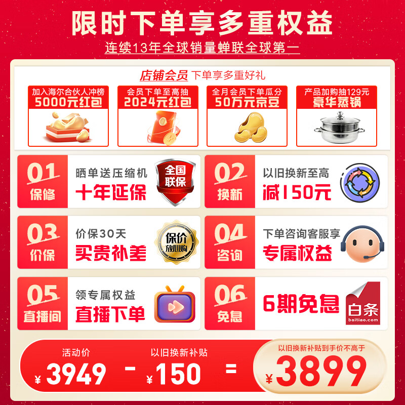海尔(Haier)330升一级能效全冷冻小冰箱风冷无霜大容量家用冷藏冷冻立式冰柜海鲜速冻BD-330WEPTU1以旧换新价格:3949.00元!