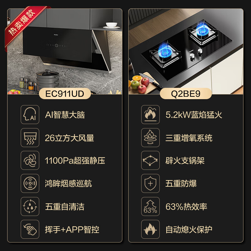 海尔(Haier)油烟机燃气灶套装 侧吸抽油烟机 26风量大吸力1100pa 5.2kw猛火灶 烟灶联动烟灶套装911UD+Q2BE9天价格:2899.00元!