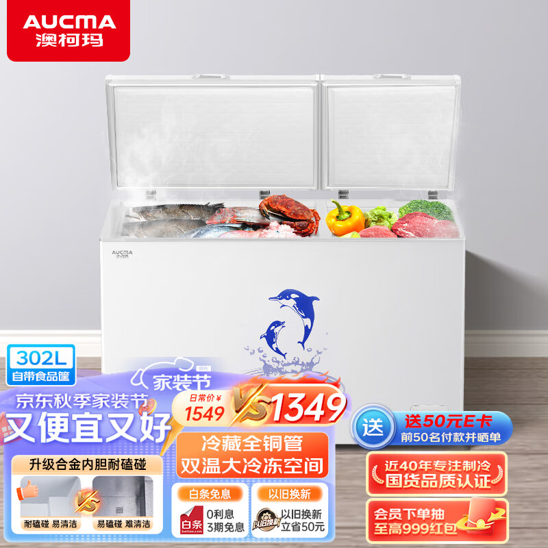 澳柯玛(AUCMA)302升 冰柜家用双温双箱商用家用大容量冰柜卧式冰柜囤货冷柜冷藏全铜管BCD-302CNE以旧换新价格:1399.00元!