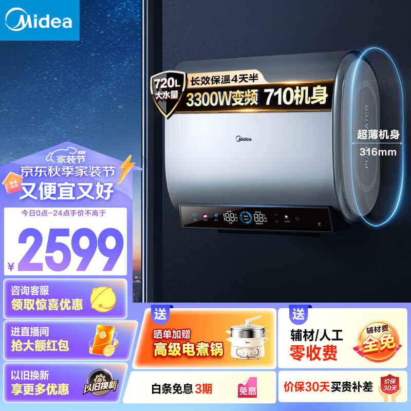 美的(Midea)60升玲珑超薄双胆扁桶电热水器防电墙3300W变频 镁棒免换出水断电F6033-UDplus一级能效以旧换新价格:2599.00元!