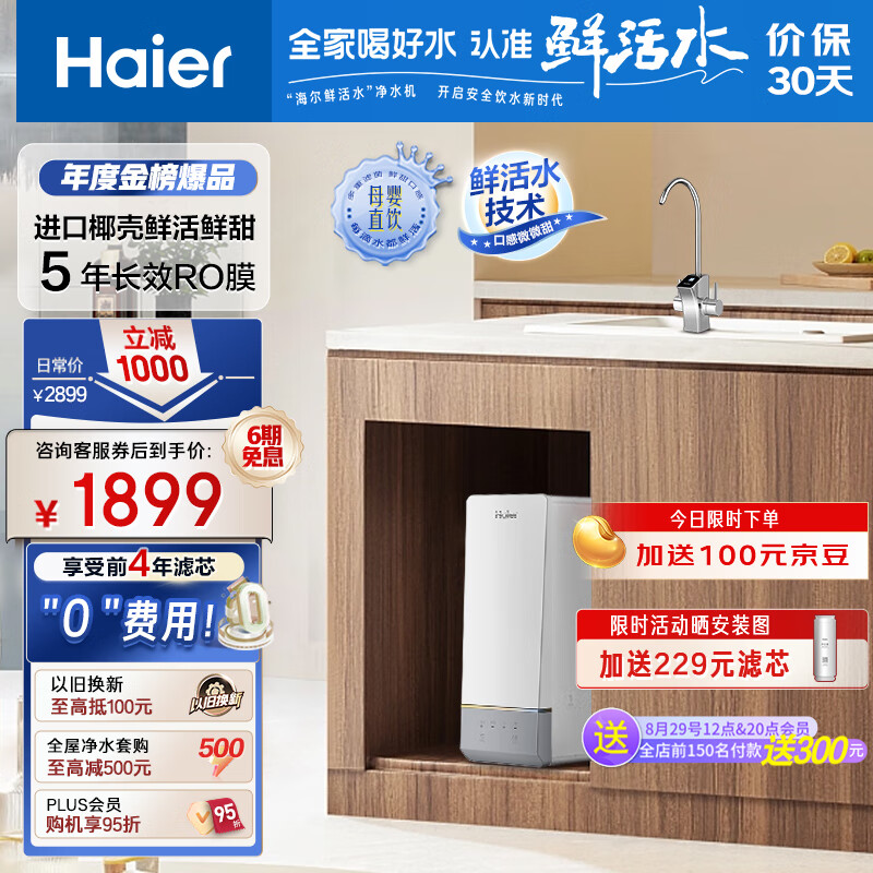 海尔(Haier)玉净【鲜活水系列】家用净水机1000G大通量双出水厨下式RO反渗透直饮母婴直饮净水器HRO10H11价格:1999.00元!