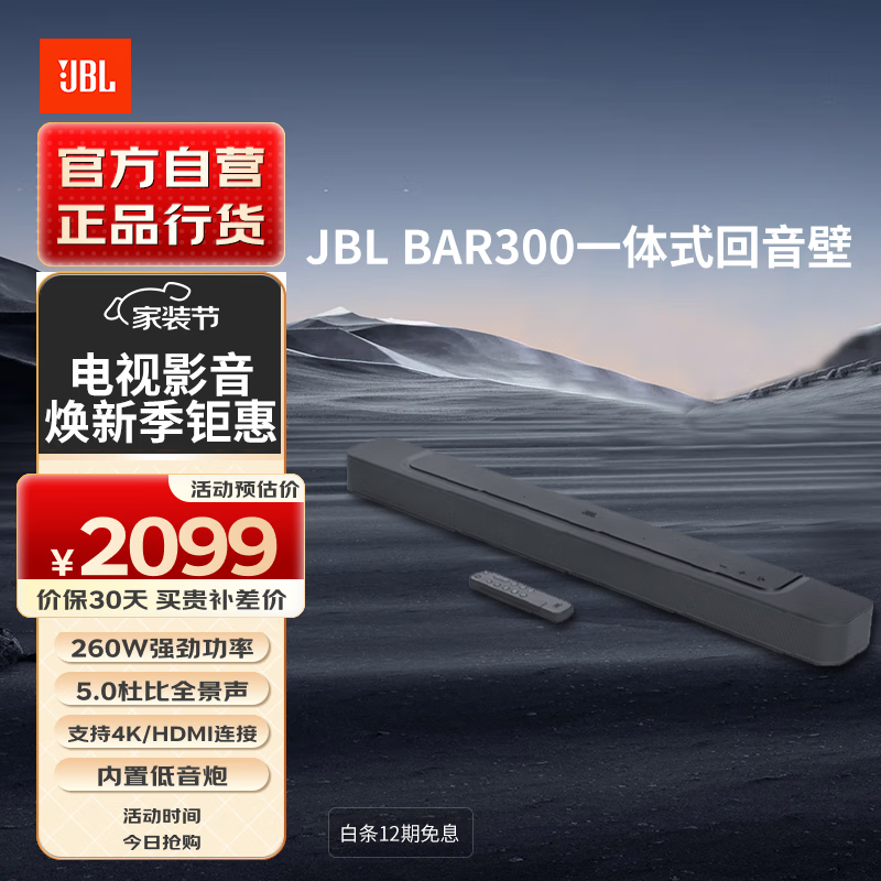 JBL BAR300紧凑型回音壁电视音响 5.0杜比全景声家庭影院soundbar 家用无线电脑音箱价格:2099.00元!
