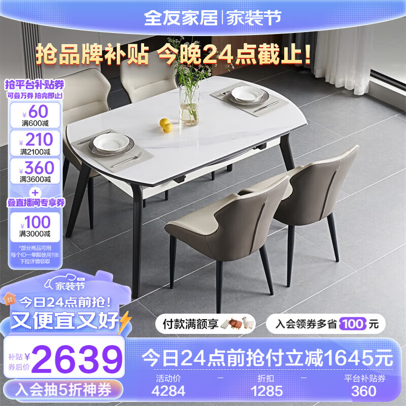 5、在全友买的岩板餐桌棒极了。送货人员送上楼还给安装好。已经用上了,可以组合成圆桌。以后再也不用在茶几上吃饭了。家里的床也是全友的,用了两年还是新的,以后家具只买全友