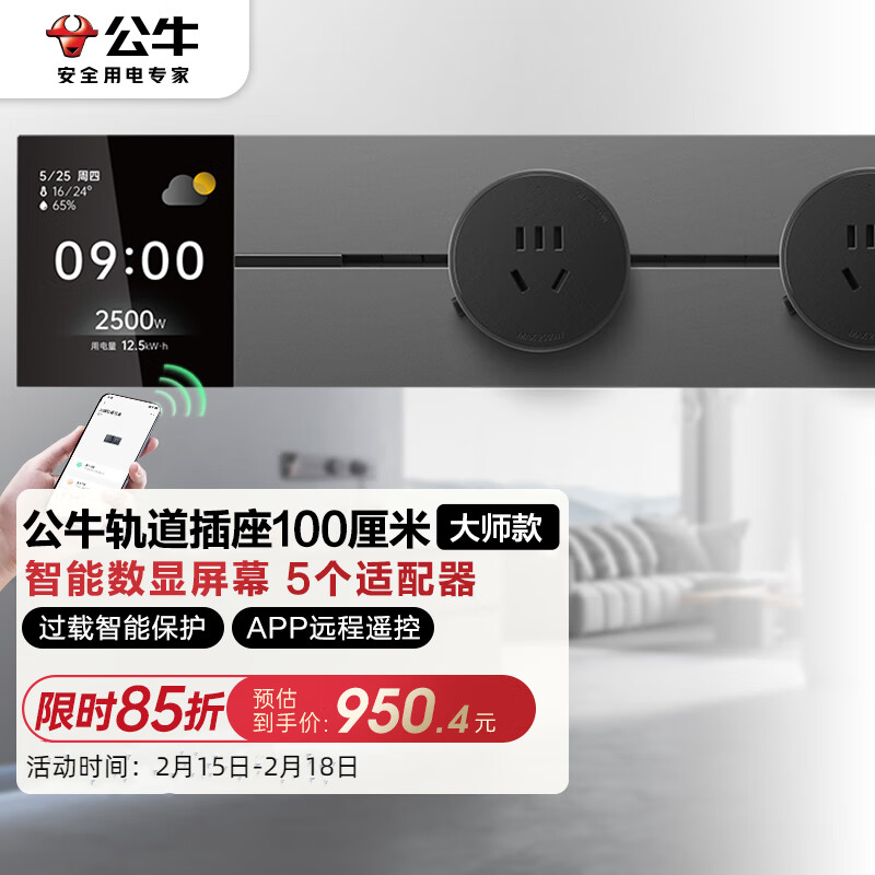 公牛(BULL)明装 轨道插座 大师屏显款可移动墙壁插座壁挂式滑轨插座 免打孔APP控制 100厘米轨道+5个五孔灰价格:1124.00元!