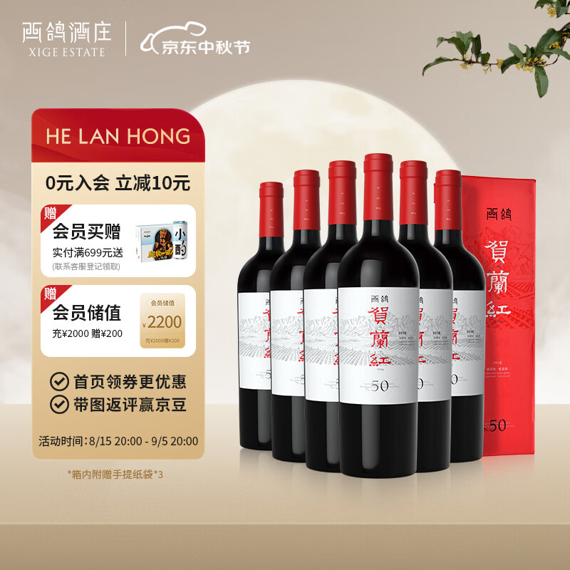 贺兰红西鸽N50干红葡萄酒750ml*6瓶整箱 宁夏贺兰山红酒中秋礼盒送礼价格:2076.00元!