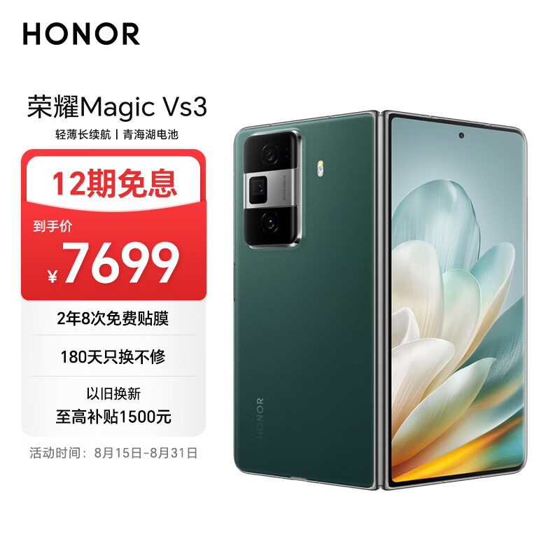 荣耀Magic Vs3 新款折叠屏 轻薄长续航 青海湖电池 荣耀绿洲护眼屏 12+512 苔原绿 拍照 5G AI智能手机价格:7699.00元!