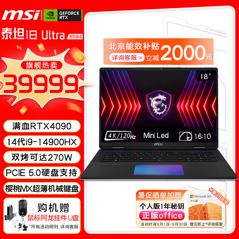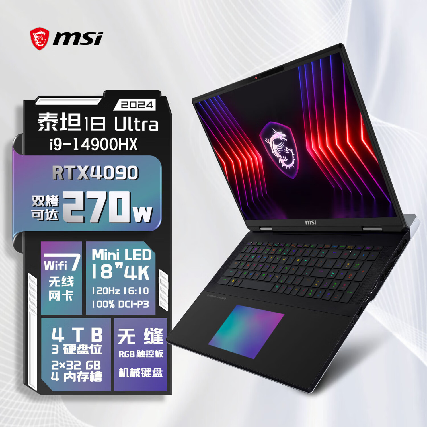 微星(MSI)【黑悟空推荐】泰坦18Ultra 2024 14代酷睿i9-14900HX 18英寸游戏笔记本电脑64GB 4T RTX4090 4K屏价格:39999.00元!