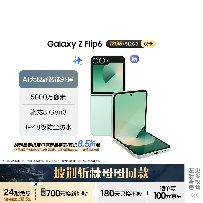 三星(SAMSUNG)Galaxy Z Flip6 AI手机 披荆斩棘哥哥同款 大视野智能外屏 双卡 折叠屏 12GB+512GB 青薄荷价格:8999.00元!